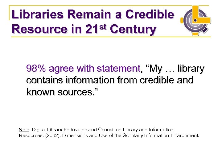 Libraries Remain a Credible Resource in 21 st Century 98% agree with statement, “My … library contains information from credible and known sources. ” Note. Digital Library Federation and Council on Library and Information Resources. (2002). Dimensions and Use of the Scholarly Information Environment.