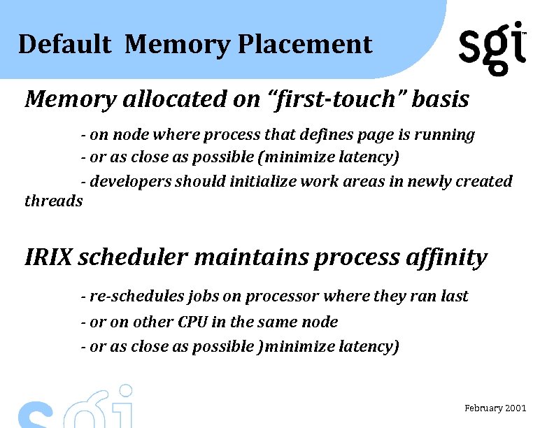 Default Memory Placement TM Memory allocated on “first-touch” basis - on node where process that defines page is running - or as close as possible (minimize latency) - developers should initialize work areas in newly created threads IRIX scheduler maintains process affinity - re-schedules jobs on processor where they ran last - or on other CPU in the same node - or as close as possible )minimize latency) February 2001