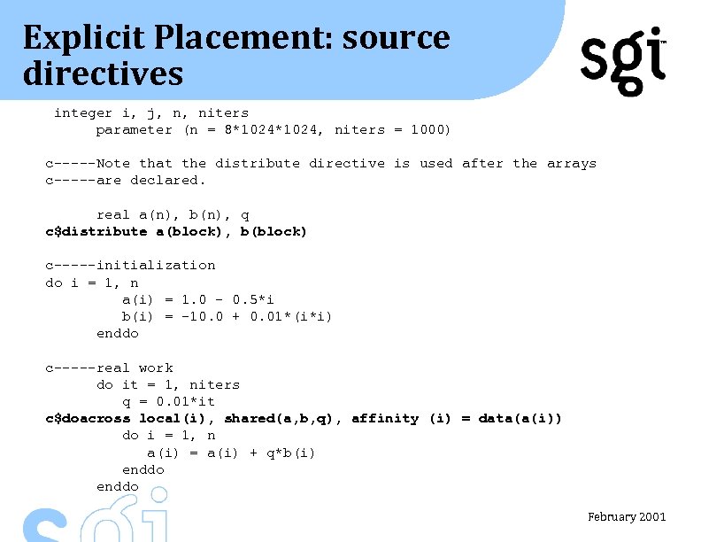 Explicit Placement: source directives TM integer i, j, n, niters parameter (n = 8*1024, niters = 1000) c-----Note that the distribute directive is used after the arrays c-----are declared. real a(n), b(n), q c$distribute a(block), b(block) c-----initialization do i = 1, n a(i) = 1. 0 - 0. 5*i b(i) = -10. 0 + 0. 01*(i*i) enddo c-----real work do it = 1, niters q = 0. 01*it c$doacross local(i), shared(a, b, q), affinity (i) = data(a(i)) do i = 1, n a(i) = a(i) + q*b(i) enddo February 2001