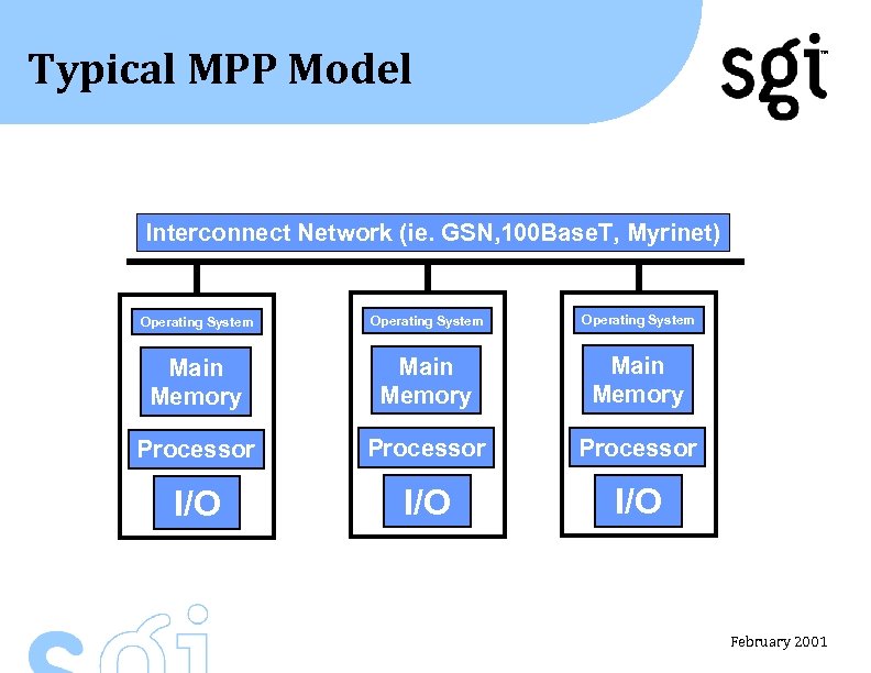 Typical MPP Model TM Interconnect Network (ie. GSN, 100 Base. T, Myrinet) Operating System Main Memory Processor I/O I/O February 2001