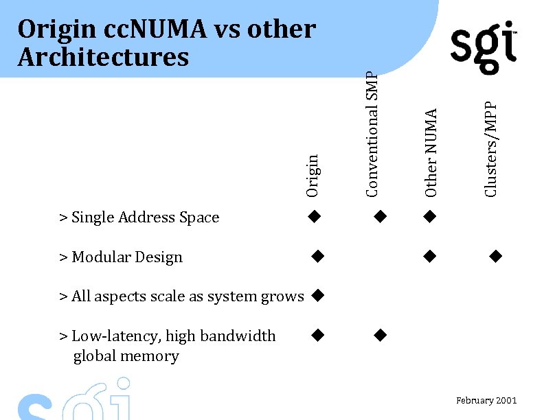 > Single Address Space > Modular Design Clusters/MPP Other NUMA TM Conventional SMP Origin cc. NUMA vs other Architectures > All aspects scale as system grows > Low-latency, high bandwidth global memory February 2001