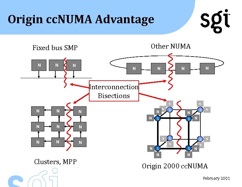 Origin cc. NUMA Advantage Other NUMA Fixed bus SMP N N TM N N N Interconnection Bisections N N N N N R R N R N N N N N R N Clusters, MPP R N N N Origin 2000 cc. NUMA February 2001