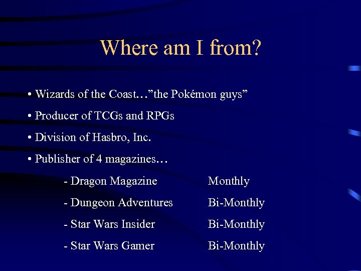 Where am I from? • Wizards of the Coast…”the Pokémon guys” • Producer of TCGs and RPGs • Division of Hasbro, Inc. • Publisher of 4 magazines… - Dragon Magazine Monthly - Dungeon Adventures Bi-Monthly - Star Wars Insider Bi-Monthly - Star Wars Gamer Bi-Monthly