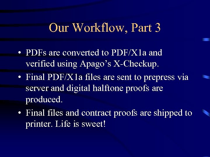 Our Workflow, Part 3 • PDFs are converted to PDF/X 1 a and verified using Apago’s X-Checkup. • Final PDF/X 1 a files are sent to prepress via server and digital halftone proofs are produced. • Final files and contract proofs are shipped to printer. Life is sweet!