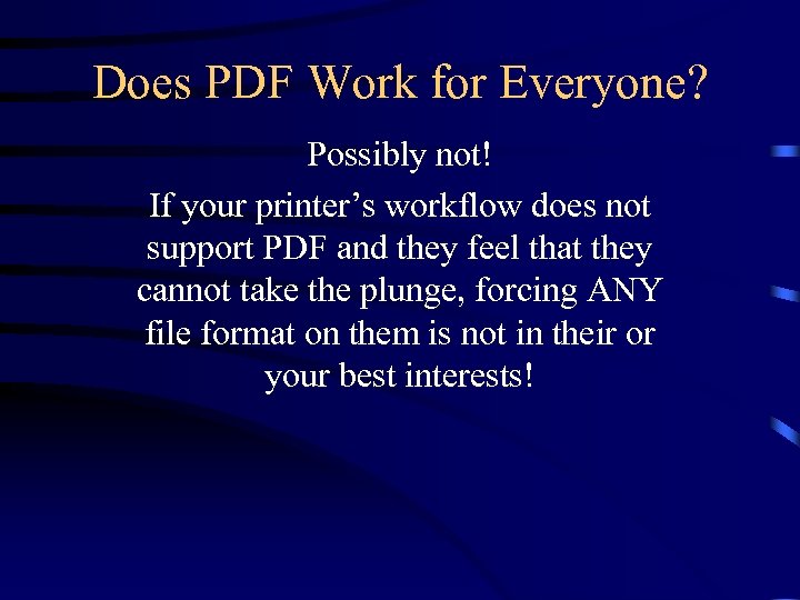 Does PDF Work for Everyone? Possibly not! If your printer’s workflow does not support PDF and they feel that they cannot take the plunge, forcing ANY file format on them is not in their or your best interests!