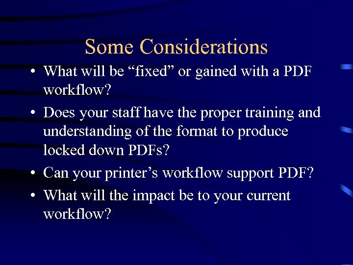 Some Considerations • What will be “fixed” or gained with a PDF workflow? • Does your staff have the proper training and understanding of the format to produce locked down PDFs? • Can your printer’s workflow support PDF? • What will the impact be to your current workflow?