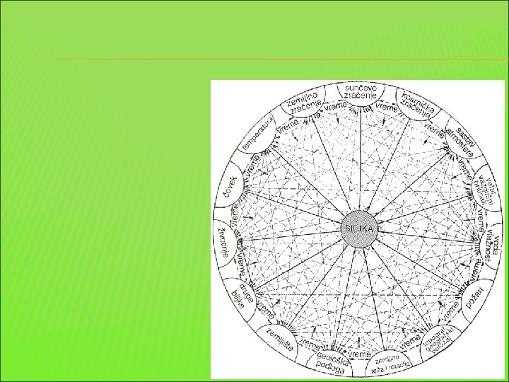 У спољашњој средини се остварују универзалне законитости живота или општи еколошки принципи, као што су: кружење материје (супстанце) и протицање енергије, хијерархијска организација и природе уопште, временскопросторни континуум животних процеса и биолошких система, трофички односи, разноврсност (биодиверзитет) биосфере, и друго. На најважнијим еколошким законитостима почива одржање и трајање живота на планети Земљи. Сваки организам, па према томе, и свака биљна врста се реализује у складу са поменутим еколошким принципима, користећи и прилагођавајући се условима и ресурсима на Земљи.