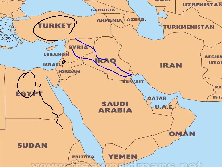 Water Bodies • Region is surrounded by bodies of water; few rivers flow all year • The Tigris and the Euphrates rivers flow through Turkey, Syria, Iraq - Fertile Crescent supported several ancient civilizations - parallel rivers meet at Shatt al Arab, empty into Persian Gulf