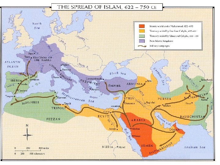 continued Islam Changes Desert Culture The Spread of Islam • Armies of Bedouin fighters move across desert - conquer desert lands, put Muslim leaders in control - spread Islamic teachings, Arabic language and culture • Muslim armies spread across Asia, Africa, Europe - by Middle Ages, large area of world is Muslim controlled NEXT