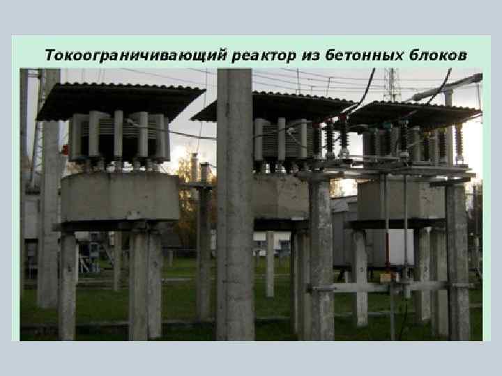 Реактор түрлері Ток шектеуіш реакторлар бөлінеді: орнату орнына байланысты: сыртқы және ішкі; кернеуі бойынша: орта (3 -35 к. В) және жоғары (110 -500 к. В); конструкциялық орындалуы бойынша: бетон, құрғақ, майлы және сауытты (броневые); фазалардың орналасуы бойынша: вертикалды, горизонталды және сатылы; орамалардың орындалуы бойынша: дара және қосарланған; функцияналды міндеті бойынша: фидерлі, фидерлі топтық және секцияаралық.