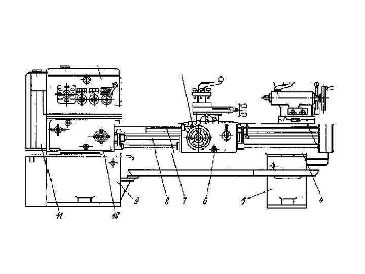 1 – передняя бабка с коробкой скоростей 6 – суппорт 2 – гитара сменных колес, 7 – задняя бабка, Коробка подач 3 5 – фартук, 4 -станина 8 – шкаф с электрообордованием