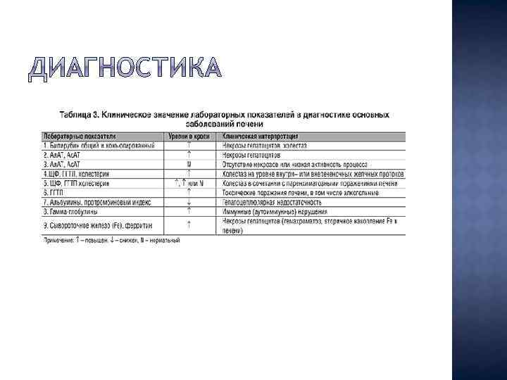 Критерии диагноза Вирусный гепатит Алкогольный гепатит Анамнез Наличие в прошлом вирусного гепатита Систематическое употребление спиртных напитков, особенно в период, предшествовавший заболеванию Первые признаки Озноб и повышение температуры Алкогольная интоксикация при вирусном гепатите А; постепенное начало, артралгии при вирусном гепатите В (по данным анамнеза) Ведущие клинические симптомы Интоксикация, нарастающая желтуха, гепатолиенальный синдром Прогрессирующая гепатомегалия при малонарушенном общем состоянии Лечебный эффект Замедлен или вовсе отсутствует вследствие прогрессирования процесса Сказывается в короткий срок при отсутствии медикаментозного лечения Картина крови Лейкопения, повышенная СОЭ Лейкоцитоз, анемия Активность Ал. Т Повышена Активность ЩФ Повышена при холестатической форме Нормальная или умеренно повышена Повышена Уровень: бета-глюкуронидазы фосфолипидов бета-липопротеидов HBs-антиген Нормальный Нередко обнаруживается Повышен Отсутствует
