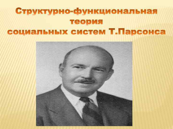 Толкотт Парсонс (1902 -1979) - социолог-теоретик, глава американский школы структурного функционализма, один из создателей современной теоретической социологии и социальной антропологии. Он был сыном священника. Изучал биологию и философию в Амхерсте, затем учился в Лондонской школе экономики и Гейдельбергском университете. В 1927 -1973 преподавал в. Гарварде, где создал и возглавил междисциплинарный Отдел социальных отношений. В 1962 -1968 несколько раз был в СССР, в частности выступал на семинаре Ю. А. Левады в Институте социологии в Москве.