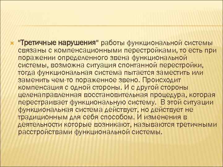 "Третичные нарушения" работы функциональной системы связаны с компенсационными перестройками, то есть при поражении определенного звена функциональной системы, возможна ситуация спонтанной перестройки, тогда функциональная система пытается заместить или заменить чем-то пораженное звено. Происходит компенсация с одной стороны. И с другой стороны целенаправленная восстановительная процедура, которая перестраивает функциональную систему. В этой ситуации функциональная система действует, но действует не традиционным для себя способом. И изменения в деятельности которые возникают, называются третичными расстройствами функциональной системы.