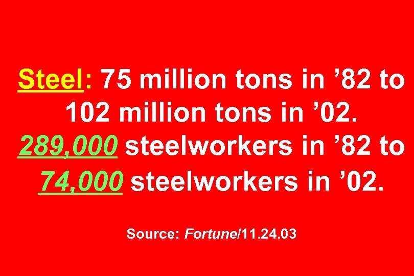 Steel: 75 million tons in ’ 82 to 102 million tons in ’ 02. 289, 000 steelworkers in ’ 82 to 74, 000 steelworkers in ’ 02. Source: Fortune/11. 24. 03