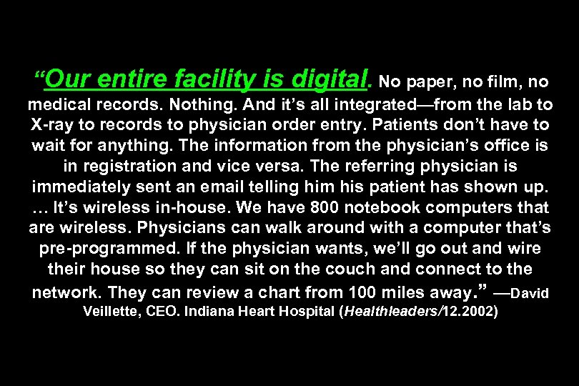 “Our entire facility is digital. No paper, no film, no medical records. Nothing. And it’s all integrated—from the lab to X-ray to records to physician order entry. Patients don’t have to wait for anything. The information from the physician’s office is in registration and vice versa. The referring physician is immediately sent an email telling him his patient has shown up. … It’s wireless in-house. We have 800 notebook computers that are wireless. Physicians can walk around with a computer that’s pre-programmed. If the physician wants, we’ll go out and wire their house so they can sit on the couch and connect to the network. They can review a chart from 100 miles away. ” —David Veillette, CEO. Indiana Heart Hospital (Healthleaders/12. 2002)