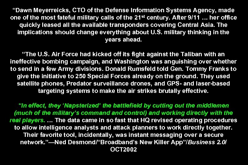 “Dawn Meyerreicks, CTO of the Defense Information Systems Agency, made one of the most fateful military calls of the 21 st century. After 9/11 … her office quickly leased all the available transponders covering Central Asia. The implications should change everything about U. S. military thinking in the years ahead. “The U. S. Air Force had kicked off its fight against the Taliban with an ineffective bombing campaign, and Washington was anguishing over whether to send in a few Army divisions. Donald Rumsfeld told Gen. Tommy Franks to give the initiative to 250 Special Forces already on the ground. They used satellite phones, Predator surveillance drones, and GPS- and laser-based targeting systems to make the air strikes brutally effective. “In effect, they ‘Napsterized’ the battlefield by cutting out the middlemen (much of the military’s command control) and working directly with the real players. … The data came in so fast that HQ revised operating procedures to allow intelligence analysts and attack planners to work directly together. Their favorite tool, incidentally, was instant messaging over a secure network. ”—Ned Desmond/“Broadband’s New Killer App”/Business 2. 0/ OCT 2002