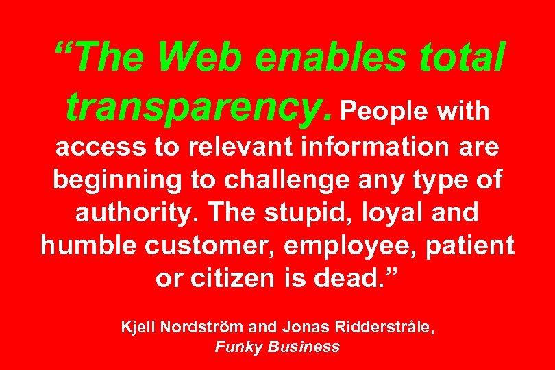 “The Web enables total transparency. People with access to relevant information are beginning to challenge any type of authority. The stupid, loyal and humble customer, employee, patient or citizen is dead. ” Kjell Nordström and Jonas Ridderstråle, Funky Business