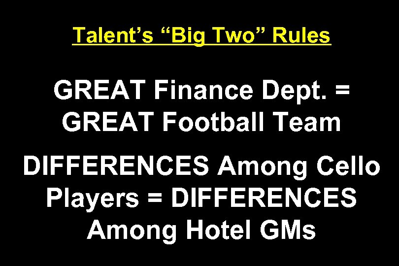 Talent’s “Big Two” Rules GREAT Finance Dept. = GREAT Football Team DIFFERENCES Among Cello Players = DIFFERENCES Among Hotel GMs
