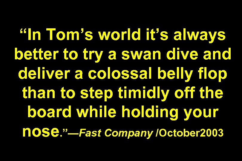 “In Tom’s world it’s always better to try a swan dive and deliver a colossal belly flop than to step timidly off the board while holding your nose. ”—Fast Company /October 2003