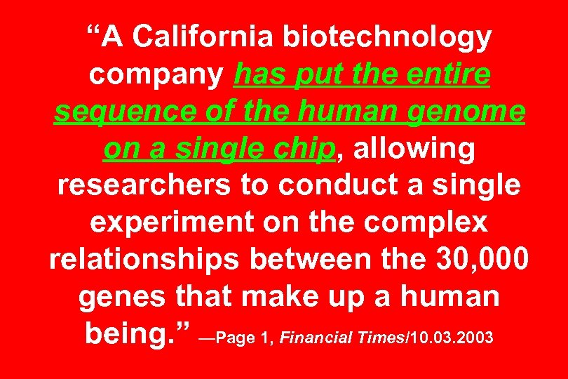 “A California biotechnology company has put the entire sequence of the human genome on a single chip, allowing researchers to conduct a single experiment on the complex relationships between the 30, 000 genes that make up a human being. ” —Page 1, Financial Times/10. 03. 2003