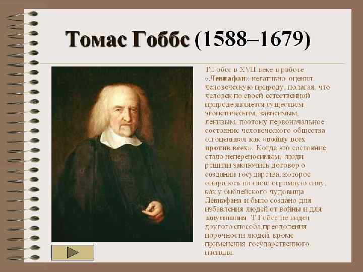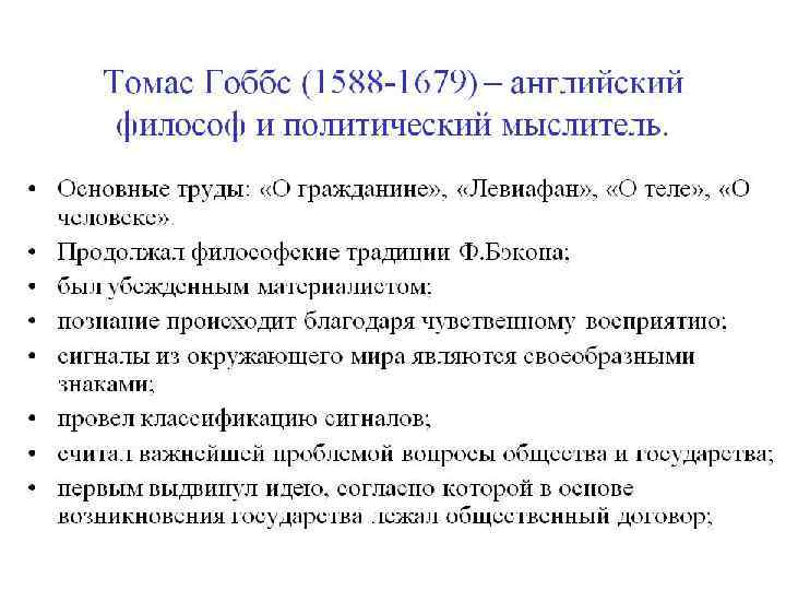 Идеи о политике и праве Гоббс — один из основателей «договорной» теории происхождения государства. Томас Гоббс Государство Гоббс рассматривает как результат договора между людьми, положившего конец естественному догосударственному состоянию «войны всех против всех» . Он придерживался принципа изначального равенства людей. Отдельные граждане добровольно ограничили свои права и свободу в пользу государства, задача которого — обеспечение мира и безопасности. Гоббс придерживается принципа правового позитивизма и превозносит роль государства, которое он признаёт абсолютным сувереном. В вопросе о формах государства симпатии Гоббса — на стороне монархии. Отстаивая необходимость подчинения церкви государству, он считал необходимым сохранение религии как орудия государственной власти для обуздания народа. Этика Гоббса исходит из неизменной чувственной «природы человека» . Основой нравственности Гоббс считал «естественный закон» — стремление к самосохранению и удовлетворению потребностей. Добродетели обусловлены разумным пониманием того, что способствует и что препятствует достижению блага. Моральный долг по своему содержанию совпадает с гражданскими обязанностями, вытекающими изобщественного договора.