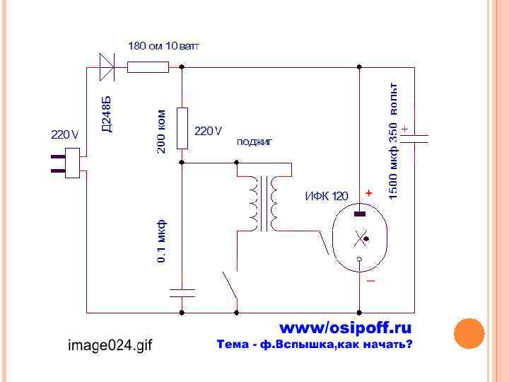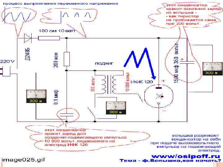 КОНСТРУКЦИЯ ИМПУЛЬСНОЙ ЛАМПЫ Устройство запуска — это повышающий автотрансформатор, на первичную обмотку которого через синхроконтакт фотоаппарата разряжается пусковой конденсатор небольшой емкости. При этом на выводе вторичной (высоковольтной) обмотки, подключенной к поджигающему электроду газоразрядной лампы, возникает переменный потенциал очень высокого напряжения (несколько тысяч вольт). Соответственно электронная фотовспышка работает следующим образом. Накопительный конденсатор, заряженный до высокого напряжения (порядка 300— 400 вольт), подсоединен к газоразрядной лампе. Однако такого напряжения на электродах лампы все же недостаточно для того, чтобы разряд произошел самопроизвольно. Для этого в нужный момент высоковольтный импульс, подаваемый на поджигающий электрод лампы, ионизирует газ внутри нее и приводит к началу разряда накопительного конденсатора через лампувспышку. За время разряда, сопровождаемого интенсивной световой вспышкой, напряжение на конденсаторе падает, и разряд прекращается.