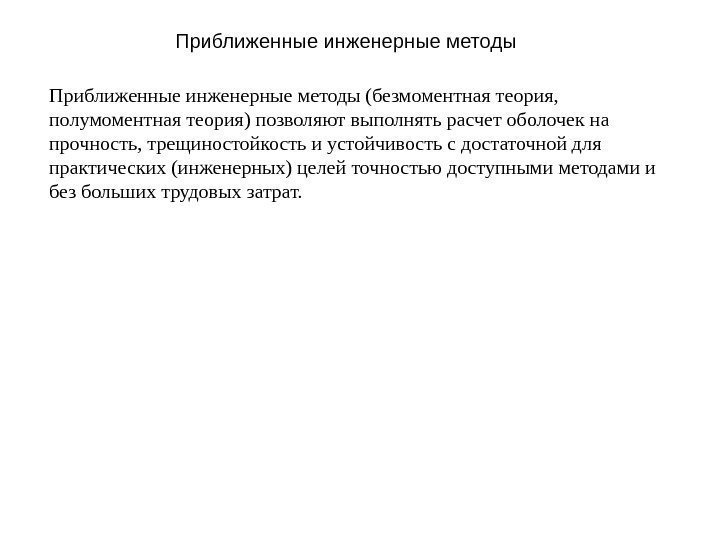 Приближенные инженерные методы (безмоментная теория, полумоментная теория) позволяют выполнять расчет оболочек на прочность, трещиностойкость и устойчивость с достаточной для практических (инженерных) целей точностью доступными методами и без больших трудовых затрат.