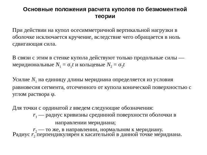 Основные положения расчета куполов по безмоментной теории При действии на купол осесимметричной вертикальной нагрузки в оболочке исключается кручение, вследствие чего обращается в ноль сдвигающая сила. В связи с этим в стенке купола действуют только продольные силы — меридиональные N 1 = σ 1 t и кольцевые N 2 = σ 2 t Усилие N 1 на единицу длины меридиана определяется из условия равновесия сегмента, отсеченного от купола конической поверхностью с углом раствора φ. Для точки с ординатой z введем следующие обозначения: r 1 — радиус кривизны срединной поверхности оболочки в направлении меридиана; r 2 — то же, в направлении, нормальном к меридиану. Радиус r 2 перпендикулярен к касательной в данной точке меридиана.