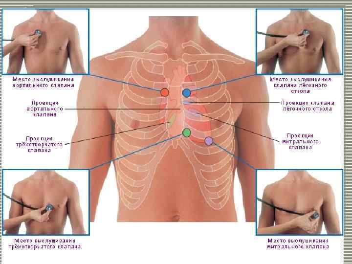 Точки аускультации сердца (I-V). I — область верхушечного толчка сердца (для выслушивания митрального клапана); II — во 2 -м межреберье у правого края грудины ("на аорте"); III — во 2 -м межреберье у левого края грудины ("на легочной артерии") ; IV — у правого края грудины в месте прикрепления к ней мечевидного отростка ("на трехстворчатом клапане");