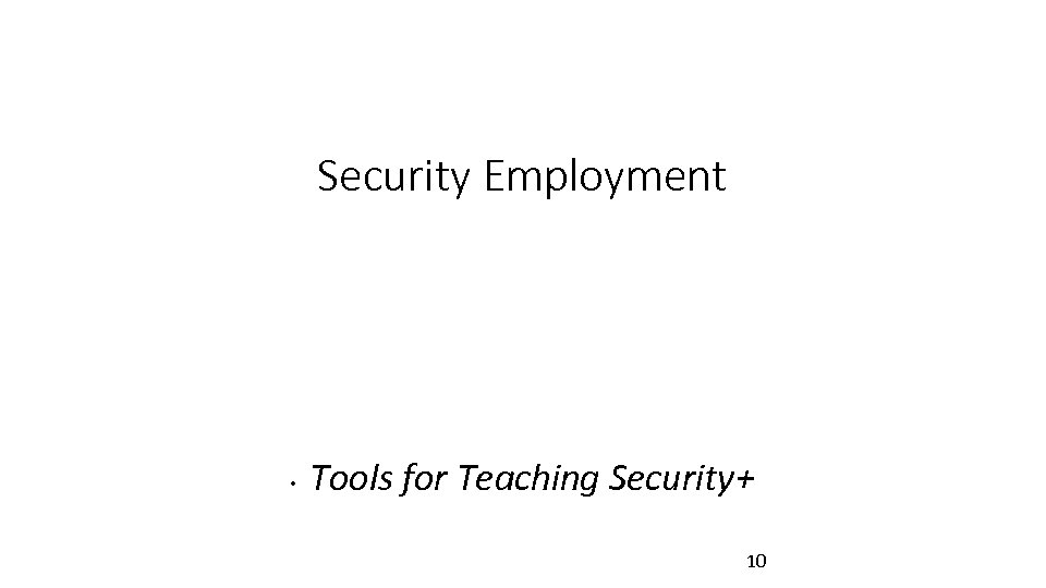 Presentation Security+ Tools • • This presentation of Tools for Teaching Security+ is more broad than deep Will not go into deep dive on any single tool; otherwise won’t be able to cover the material Few tools demonstrated while most introduced None of these in Security+ Guide to Network Security Fundamentals 5 e Hands-On Projects • Presented where fall in current chapter • Tools for student Hands-On Projects and demos 9