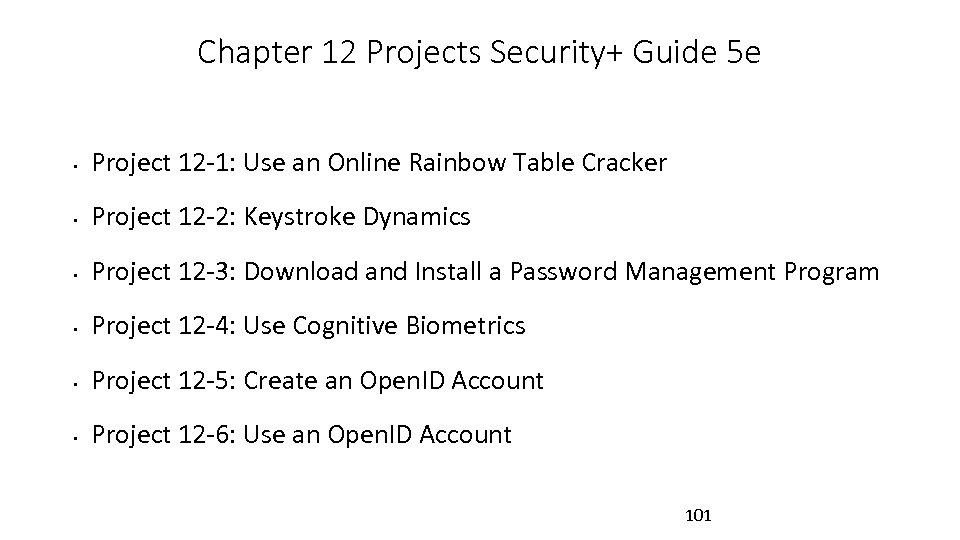 Chapter 12 Projects Security+ Guide 5 e • Project 12 -1: Use an Online Rainbow Table Cracker • Project 12 -2: Keystroke Dynamics • Project 12 -3: Download and Install a Password Management Program • Project 12 -4: Use Cognitive Biometrics • Project 12 -5: Create an Open. ID Account • Project 12 -6: Use an Open. ID Account 101