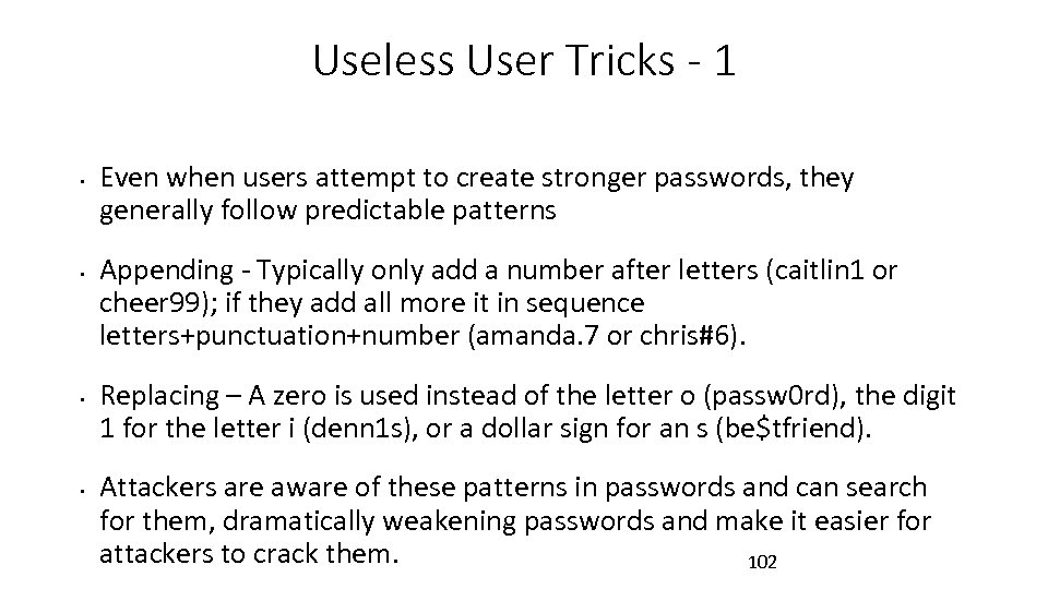 Useless User Tricks - 1 • • Even when users attempt to create stronger passwords, they generally follow predictable patterns Appending - Typically only add a number after letters (caitlin 1 or cheer 99); if they add all more it in sequence letters+punctuation+number (amanda. 7 or chris#6). Replacing – A zero is used instead of the letter o (passw 0 rd), the digit 1 for the letter i (denn 1 s), or a dollar sign for an s (be$tfriend). Attackers are aware of these patterns in passwords and can search for them, dramatically weakening passwords and make it easier for attackers to crack them. 102