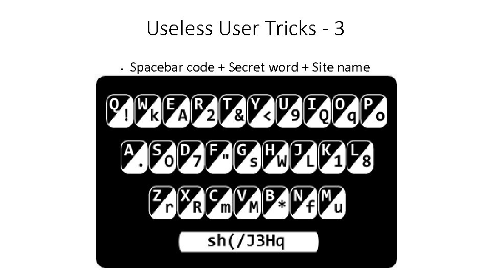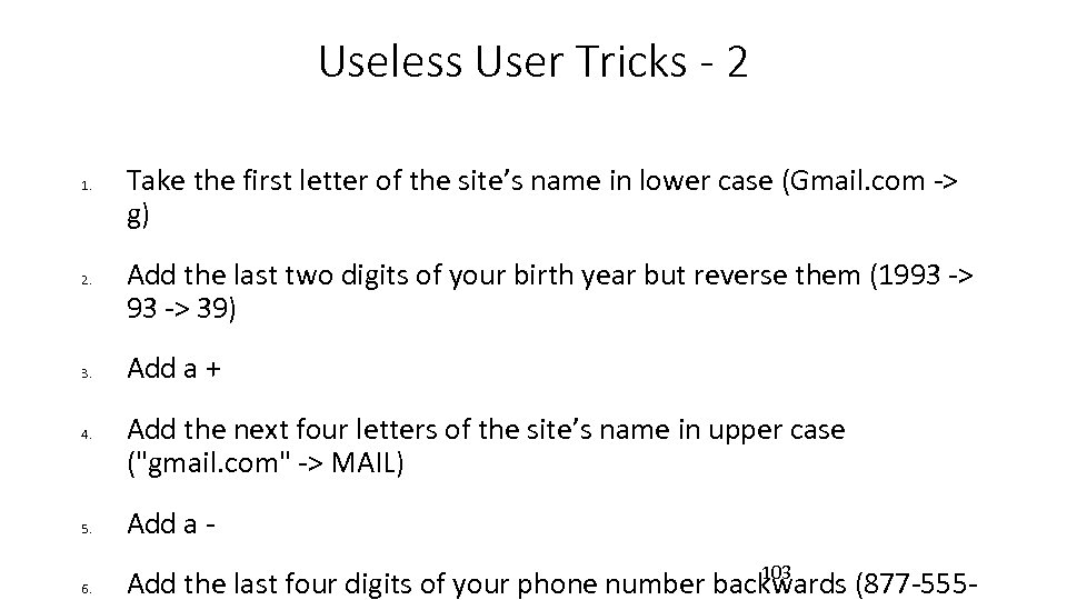Useless User Tricks - 2 1. 2. 3. 4. Take the first letter of the site’s name in lower case (Gmail. com -> g) Add the last two digits of your birth year but reverse them (1993 -> 39) Add a + Add the next four letters of the site’s name in upper case ("gmail. com" -> MAIL) 5. Add a - 6. 103 Add the last four digits of your phone number backwards (877 -555 -