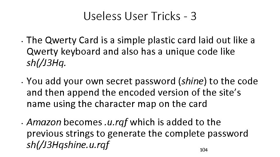 Useless User Tricks - 3 • • • The Qwerty Card is a simple plastic card laid out like a Qwerty keyboard and also has a unique code like sh(/J 3 Hq. You add your own secret password (shine) to the code and then append the encoded version of the site’s name using the character map on the card Amazon becomes. u. rqf which is added to the previous strings to generate the complete password sh(/J 3 Hqshine. u. rqf 104
