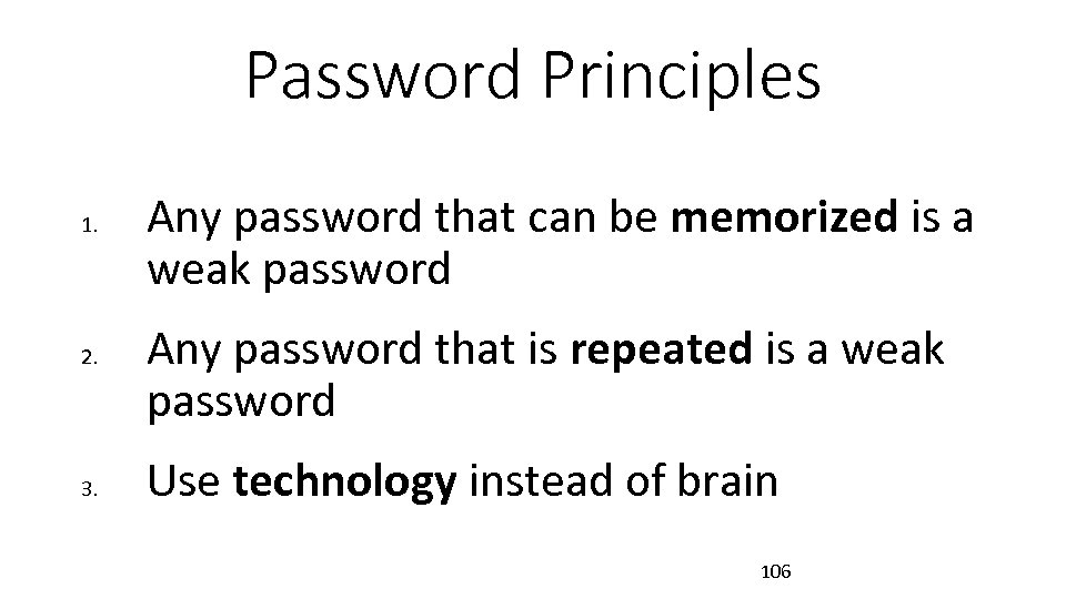 Password Principles 1. 2. 3. Any password that can be memorized is a weak password Any password that is repeated is a weak password Use technology instead of brain 106
