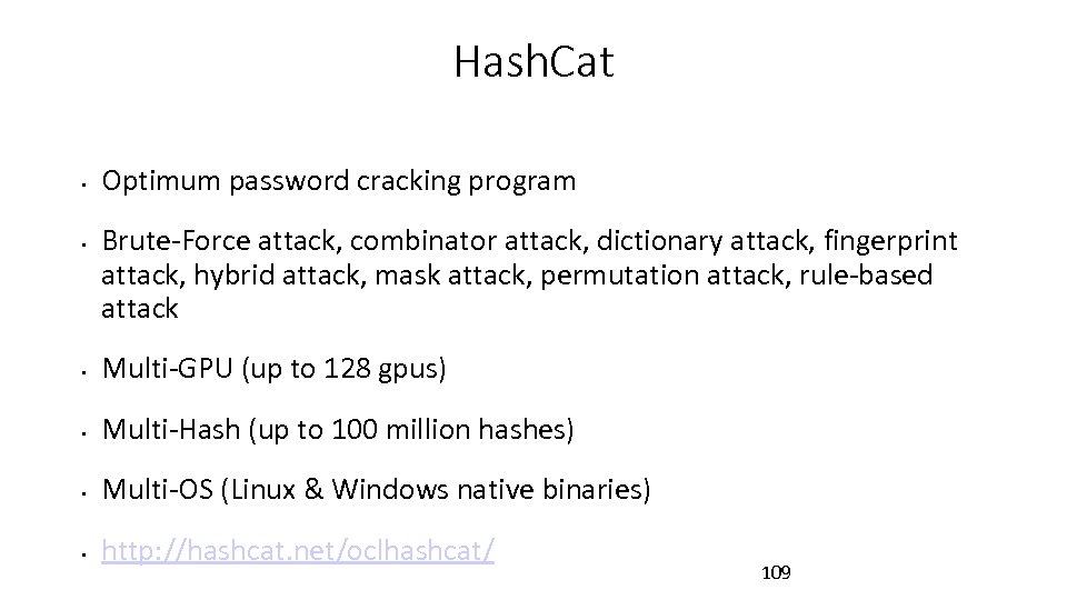 Hash. Cat • • Optimum password cracking program Brute-Force attack, combinator attack, dictionary attack, fingerprint attack, hybrid attack, mask attack, permutation attack, rule-based attack • Multi-GPU (up to 128 gpus) • Multi-Hash (up to 100 million hashes) • Multi-OS (Linux & Windows native binaries) • http: //hashcat. net/oclhashcat/ 109