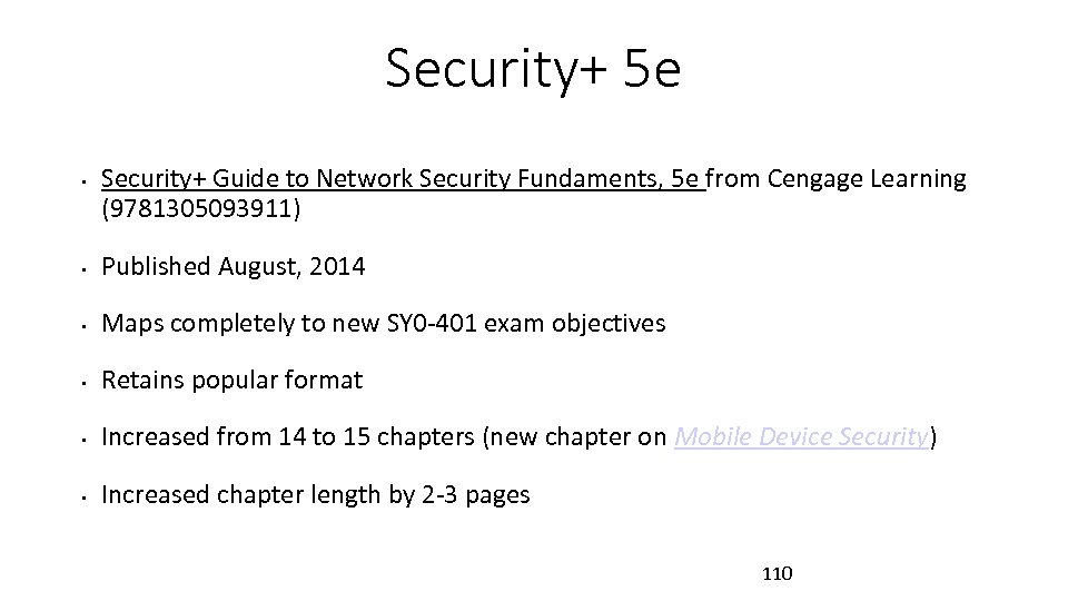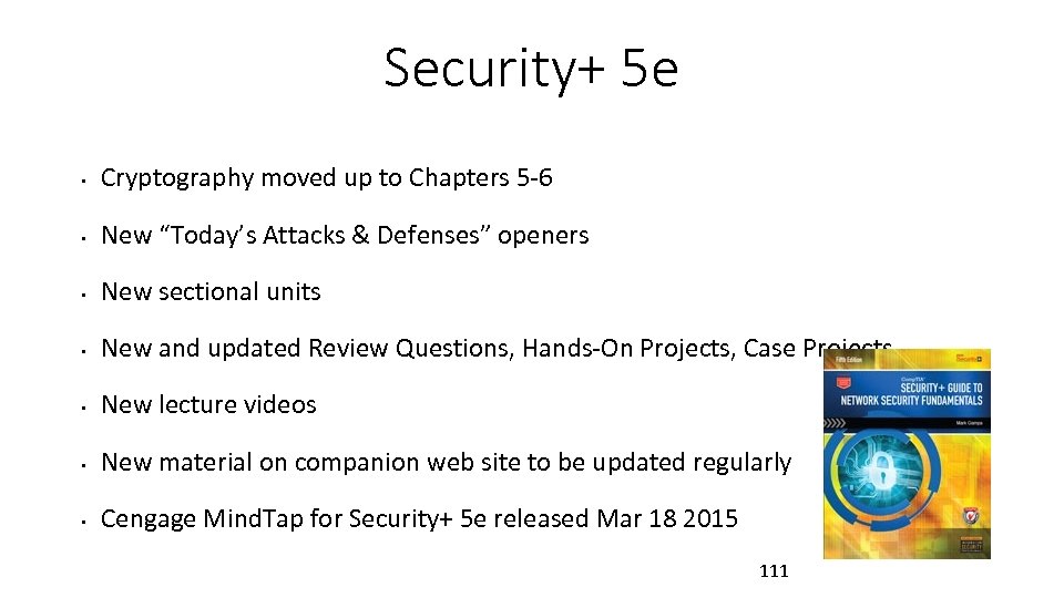 Security+ 5 e • Security+ Guide to Network Security Fundaments, 5 e from Cengage Learning (9781305093911) • Published August, 2014 • Maps completely to new SY 0 -401 exam objectives • Retains popular format • Increased from 14 to 15 chapters (new chapter on Mobile Device Security) • Increased chapter length by 2 -3 pages 110