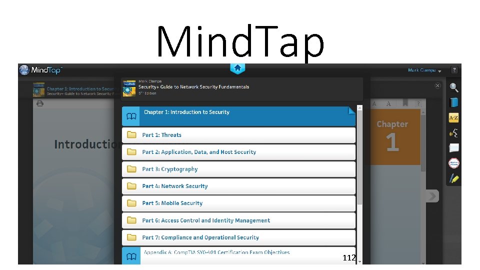 Security+ 5 e • Cryptography moved up to Chapters 5 -6 • New “Today’s Attacks & Defenses” openers • New sectional units • New and updated Review Questions, Hands-On Projects, Case Projects • New lecture videos • New material on companion web site to be updated regularly • Cengage Mind. Tap for Security+ 5 e released Mar 18 2015 111