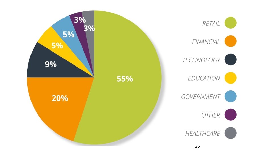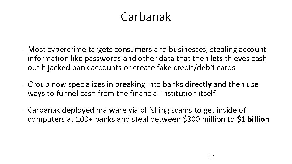 Carbanak • • • Most cybercrime targets consumers and businesses, stealing account information like passwords and other data that then lets thieves cash out hijacked bank accounts or create fake credit/debit cards Group now specializes in breaking into banks directly and then use ways to funnel cash from the financial institution itself Carbanak deployed malware via phishing scams to get inside of computers at 100+ banks and steal between $300 million to $1 billion 12