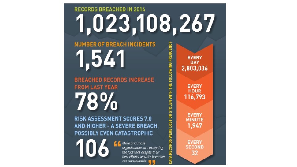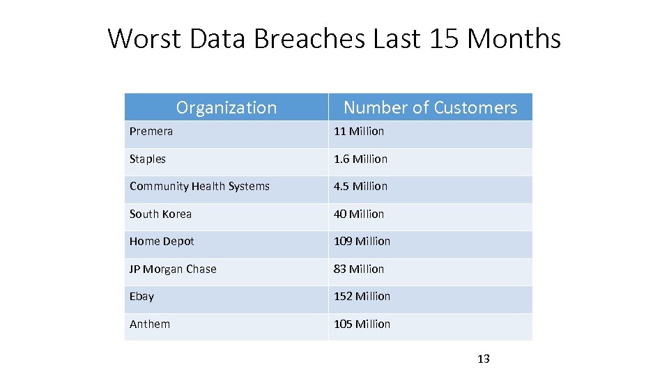 Worst Data Breaches Last 15 Months Organization Number of Customers Premera 11 Million Staples 1. 6 Million Community Health Systems 4. 5 Million South Korea 40 Million Home Depot 109 Million JP Morgan Chase 83 Million Ebay 152 Million Anthem 105 Million 13