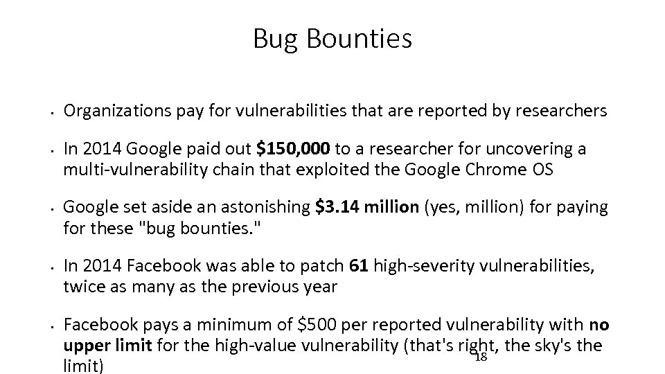 Bug Bounties • • • Organizations pay for vulnerabilities that are reported by researchers In 2014 Google paid out $150, 000 to a researcher for uncovering a multi-vulnerability chain that exploited the Google Chrome OS Google set aside an astonishing $3. 14 million (yes, million) for paying for these "bug bounties. " In 2014 Facebook was able to patch 61 high-severity vulnerabilities, twice as many as the previous year Facebook pays a minimum of $500 per reported vulnerability with no upper limit for the high-value vulnerability (that's right, the sky's the 18 limit)