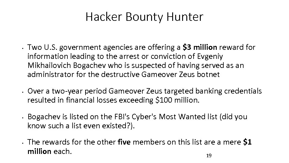 Hacker Bounty Hunter • • Two U. S. government agencies are offering a $3 million reward for information leading to the arrest or conviction of Evgeniy Mikhailovich Bogachev who is suspected of having served as an administrator for the destructive Gameover Zeus botnet Over a two-year period Gameover Zeus targeted banking credentials resulted in financial losses exceeding $100 million. Bogachev is listed on the FBI's Cyber's Most Wanted list (did you know such a list even existed? ). The rewards for the other five members on this list are a mere $1 million each. 19