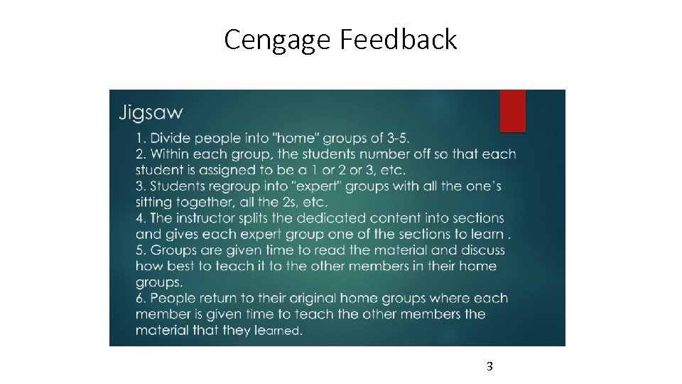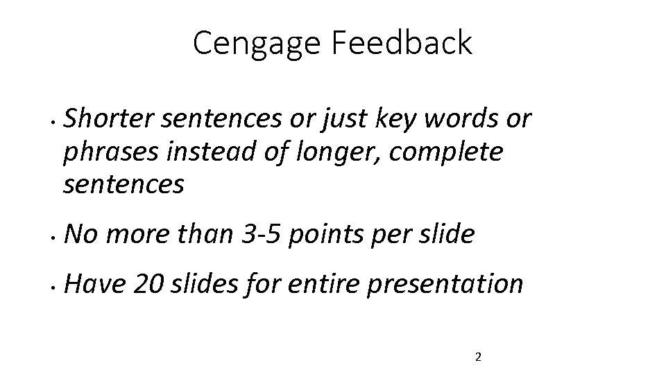 Cengage Feedback • Shorter sentences or just key words or phrases instead of longer, complete sentences • No more than 3 -5 points per slide • Have 20 slides for entire presentation 2