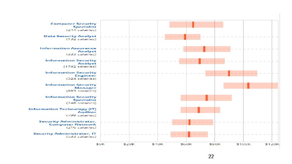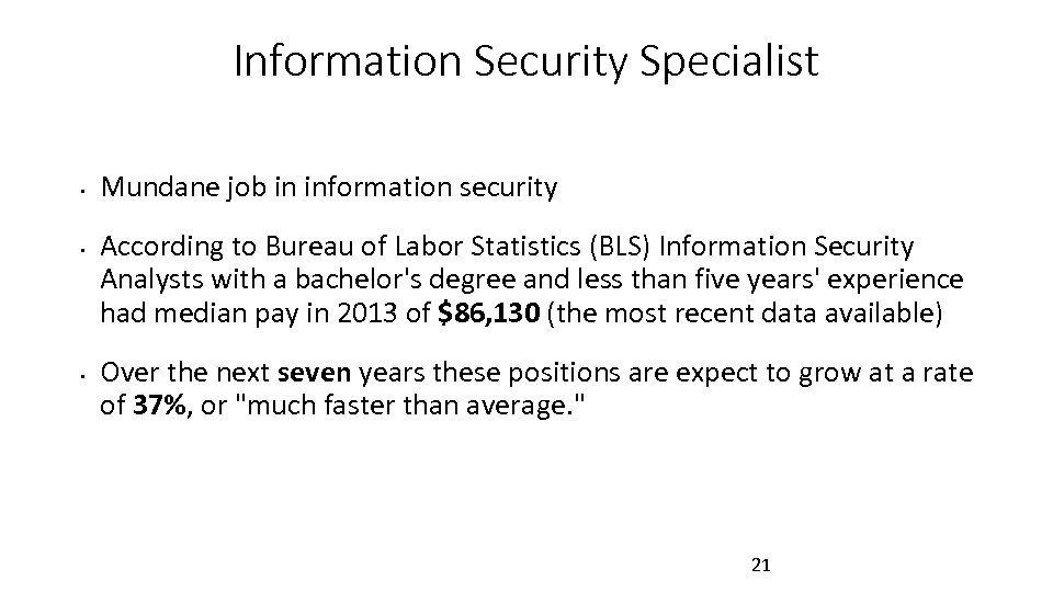 Information Security Specialist • • • Mundane job in information security According to Bureau of Labor Statistics (BLS) Information Security Analysts with a bachelor's degree and less than five years' experience had median pay in 2013 of $86, 130 (the most recent data available) Over the next seven years these positions are expect to grow at a rate of 37%, or "much faster than average. " 21