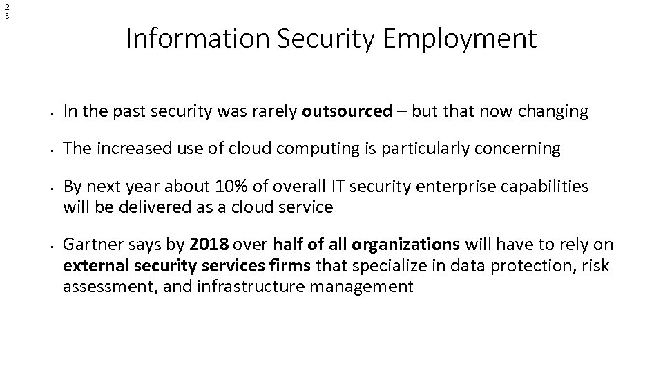 2 3 Information Security Employment • In the past security was rarely outsourced – but that now changing • The increased use of cloud computing is particularly concerning • • By next year about 10% of overall IT security enterprise capabilities will be delivered as a cloud service Gartner says by 2018 over half of all organizations will have to rely on external security services firms that specialize in data protection, risk assessment, and infrastructure management