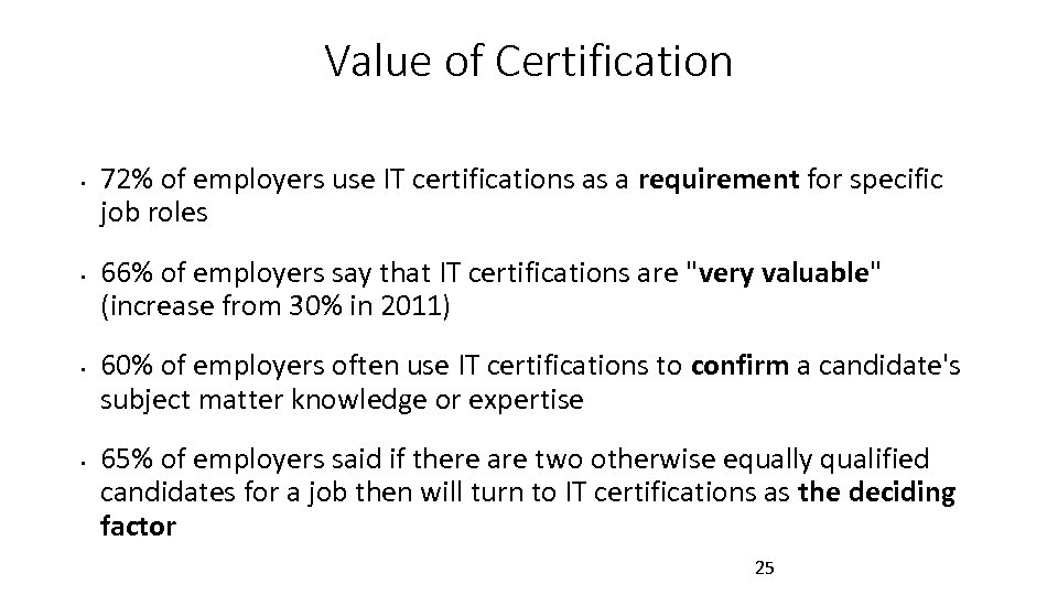 Value of Certification • • 72% of employers use IT certifications as a requirement for specific job roles 66% of employers say that IT certifications are "very valuable" (increase from 30% in 2011) 60% of employers often use IT certifications to confirm a candidate's subject matter knowledge or expertise 65% of employers said if there are two otherwise equally qualified candidates for a job then will turn to IT certifications as the deciding factor 25