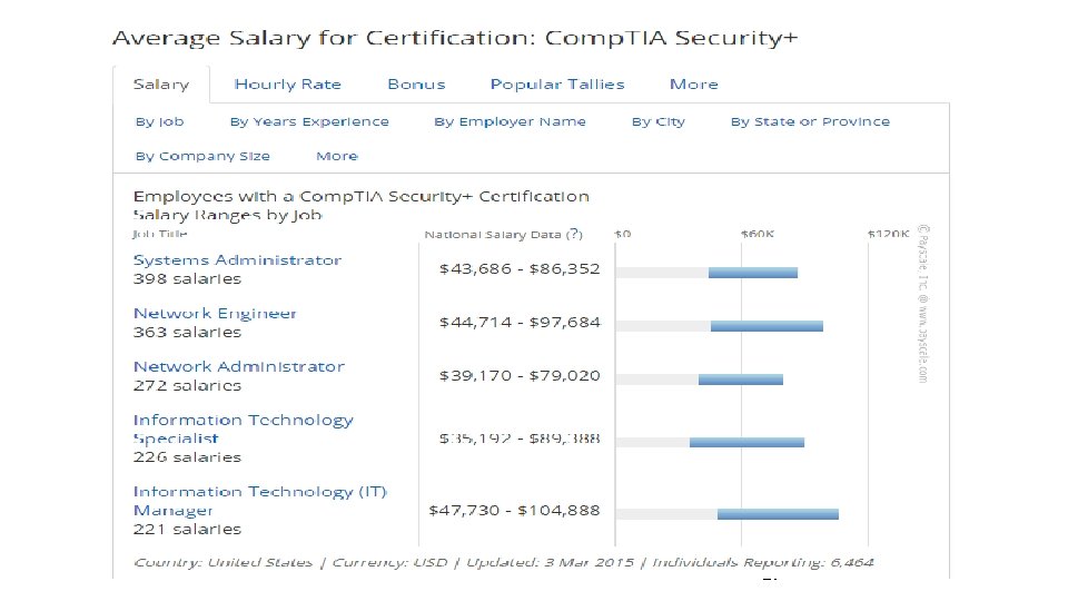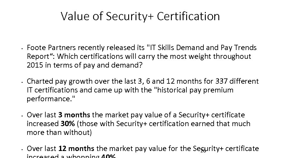 Value of Security+ Certification • • Foote Partners recently released its "IT Skills Demand Pay Trends Report“: Which certifications will carry the most weight throughout 2015 in terms of pay and demand? Charted pay growth over the last 3, 6 and 12 months for 337 different IT certifications and came up with the "historical pay premium performance. " Over last 3 months the market pay value of a Security+ certificate increased 30% (those with Security+ certification earned that much more than without) Over last 12 months the market pay value for the Security+ certificate 26