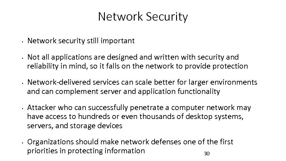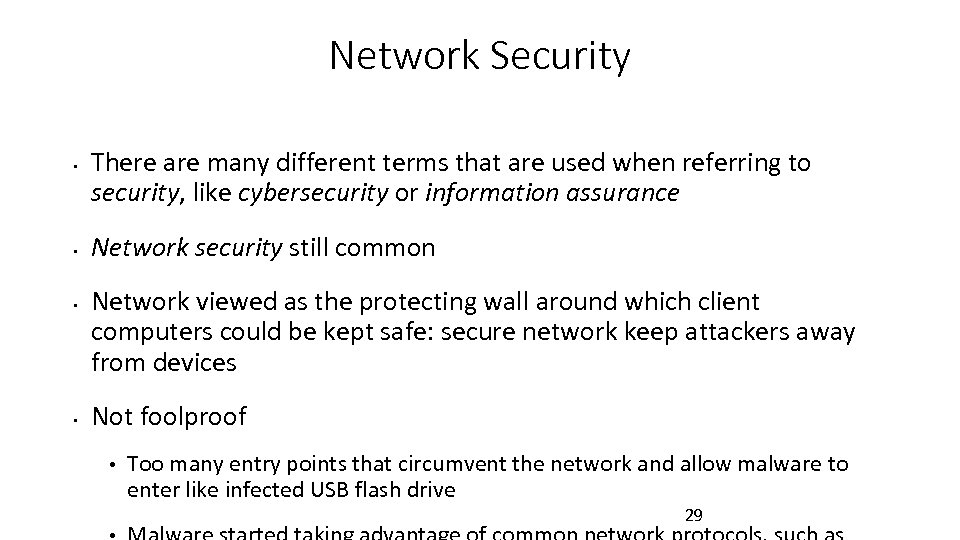 Network Security • • There are many different terms that are used when referring to security, like cybersecurity or information assurance Network security still common Network viewed as the protecting wall around which client computers could be kept safe: secure network keep attackers away from devices Not foolproof • Too many entry points that circumvent the network and allow malware to enter like infected USB flash drive 29