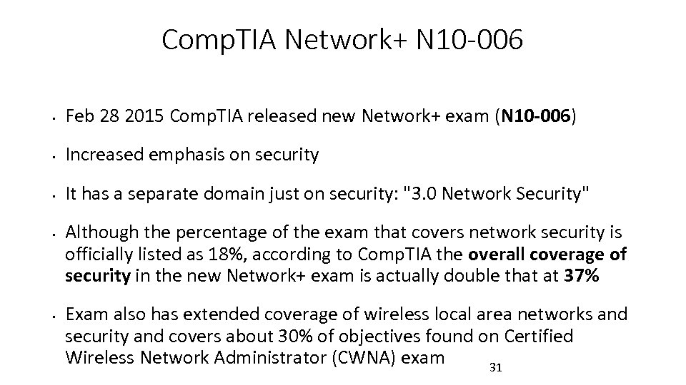 Comp. TIA Network+ N 10 -006 • Feb 28 2015 Comp. TIA released new Network+ exam (N 10 -006) • Increased emphasis on security • It has a separate domain just on security: "3. 0 Network Security" • • Although the percentage of the exam that covers network security is officially listed as 18%, according to Comp. TIA the overall coverage of security in the new Network+ exam is actually double that at 37% Exam also has extended coverage of wireless local area networks and security and covers about 30% of objectives found on Certified Wireless Network Administrator (CWNA) exam 31